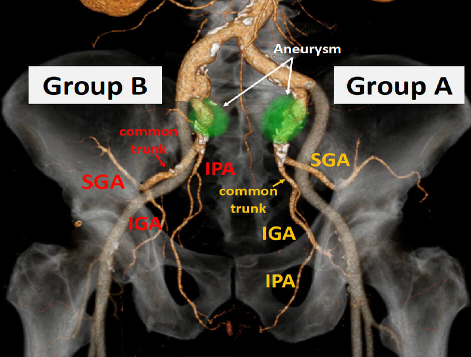 内腸骨動脈瘤は、他の動脈瘤と同様に放置すると破裂し生命の危険がある病気です。しかしその発生原因は解明されていません。私達はこれまでの手術症例の解析から、内腸骨動脈の枝である上臀動脈と下臀動脈が、長い共通幹を有する特徴的な内腸骨動脈の分岐パターン(下図におけるGroup B)が、内腸骨動脈瘤の存在と関連することを発見しました。先天的な血管の枝分かれのパターンが、血行動態を通じて動脈壁に影響を及ぼし、瘤の形成に関与している可能性があります。
